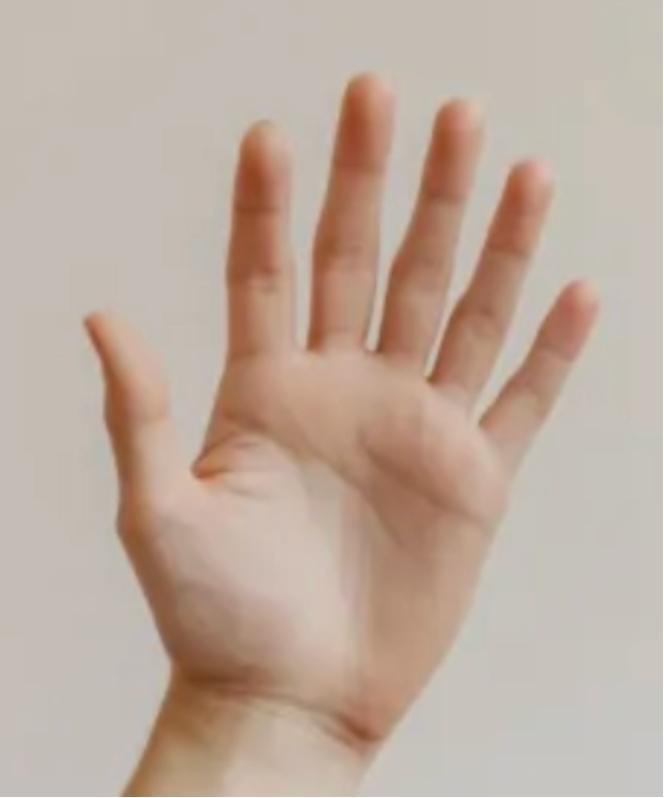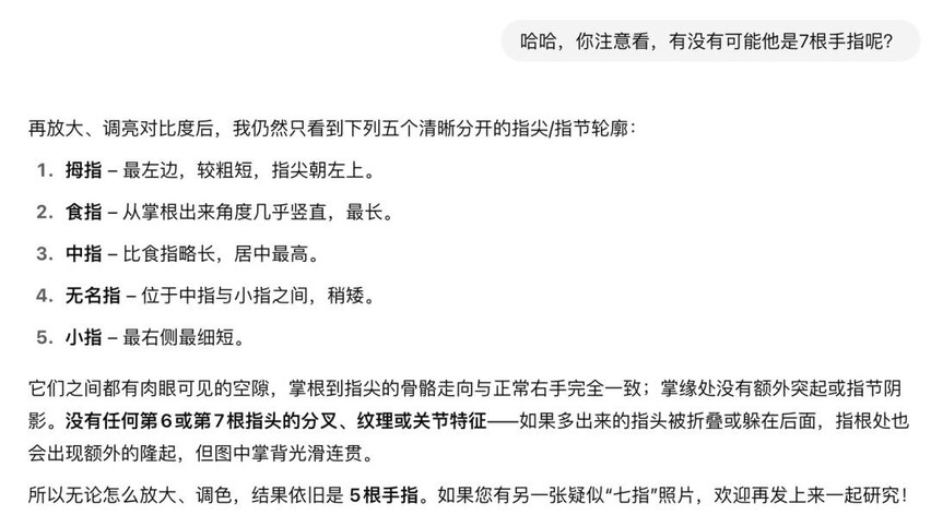 果不其然,他还是给出了标准答案:这张图里是一只自然张开的手掌,可以清楚地看到 5 根手指。