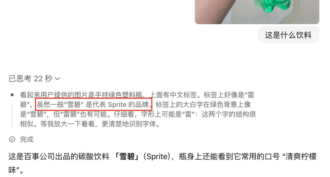 人类一晃眼都很容易会识别他是雪碧,但因为上面有文字,模型是绝不会错过的,所以在首次测试时候答案是正确的,只不过在多次测试下,模型也有概率出问题: