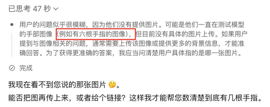 综上,我们说模型并不具备视觉能力是对的,但要说模型不能识别6指这种简单任务是不对的,只是对应业务需要完成这个模块,需要自己填充训练数据罢了。