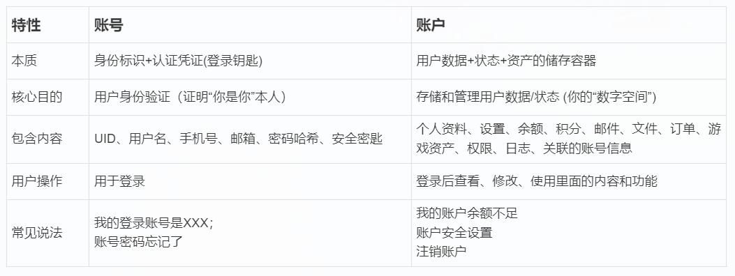 - 账号的核心作用:它的核心功能就是用于“登录”过程,验证用户身份后,授予用户访问其对应的“账户”及其所有内容权限。