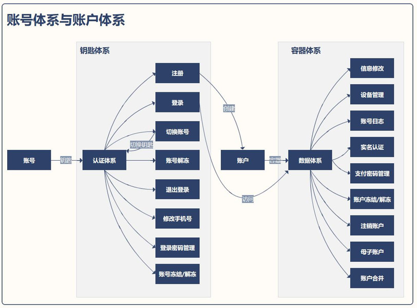 - 双体系:注册(同时涉及账号和账户的创建) – 设备管理和账号日志可能涉及双体系,但主要归属账户体系(因为设备管理是管理哪些设备(钥匙)可以访问容器,日志记录的是对容器的访问和操作)