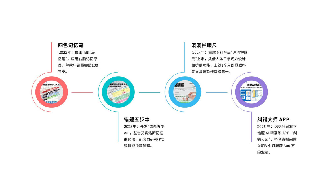 2022年,该公司推出“四色记忆笔”,应用右脑记忆原理,单款年销量突破100万支。2023年,公司开发了“错题五步本”,整合艾宾浩斯记忆曲线,配套自研APP实现智能错题管理。其旗下纠错工具包内置9亿题库,支持错题拍照、错题智能打印、错题AI举一反三等功能。2024年其首款专利产品“洞洞护眼尺”上市,凭借人体工学巧妙设计和护眼功能,上线1个月即登顶抖音文具爆款榜双榜第一。