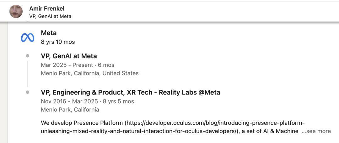 Amir Frenkel最早是Oculus员工,Oculus被收购后并入Meta搞了10年XR中的AI视觉技术,2025年3月转为生成式AI副总裁。