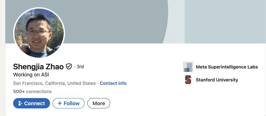 与Alexandr Wang直接合作的是赵晟佳,Meta从OpenAI挖来的这位清华校友担任整个MSL的首席AI科学家。