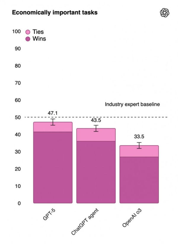 OpenAI 表示,ChatGPT-5在知识工作方面表现卓越,其知识水平在40多种职业中均达到或超过专家水平,涵盖法律、物流、销售和工程等领域。