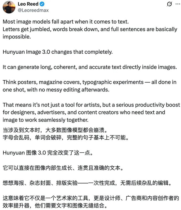 发布一周来,混元图像 3.0 迅速在创作者圈中走红。无论是画面质感、细节还原,还是构图理解与风格一致性,很多网友都表示这款模型的生成效果远超预期。