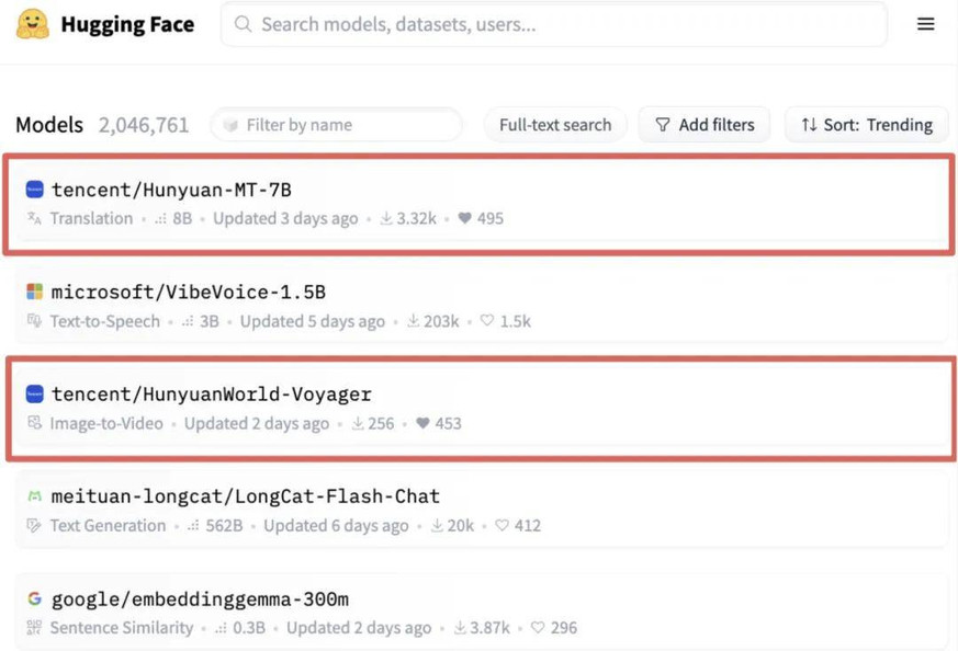 当然,腾讯也在积极布局开源。上月初开源的混元翻译模型 Hunyuan-MT-7B 以及最新的世界模型 HunyuanWorld-Voyager 一度在 Hugging Face 模型趋势榜单前三中占据两席。