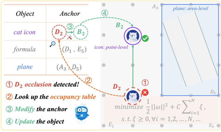 - 为解决自动生成中常见的元素遮挡、位置错乱等空间布局问题,文本提出视觉锚点提示(Visual Anchor Prompt),为关键视觉元素(如公式、图表、文本框)在画面中的相对位置和层次提供了结构化的指导。在生成代码时,自动维护锚点提示表,记录放置对象以及对应锚点坐标;在检查到视频中布局不当时,Critic 会查表并生成具体的新锚点、以及可执行的反馈(如 move to B2)给 Coder 进行迭代修正。