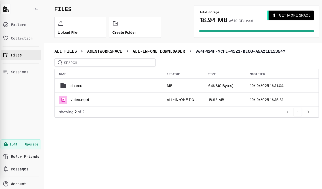 在 MuleRun 上我发现就有这样的工具,输入一个链接,返回下载好的视频。对我来说,这就是「一次性专业需求」,而我,也确实愿意为此付出 50 积分。