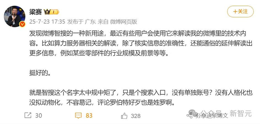AI知识大V「梁赛」也点赞说,自己微博里的专业技术内容,比如算力服务器的相关解读,在智搜的辅助解读下就让用户们更清晰了。
