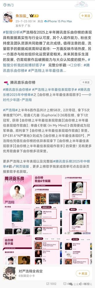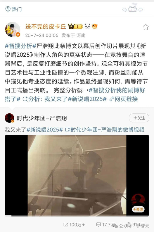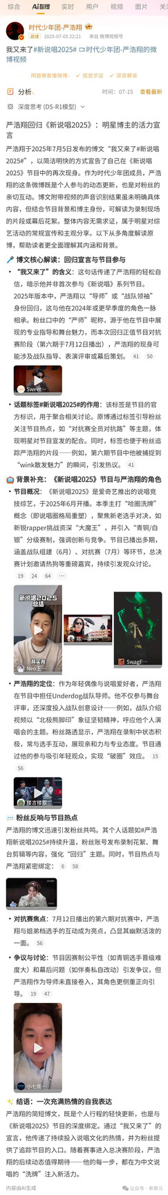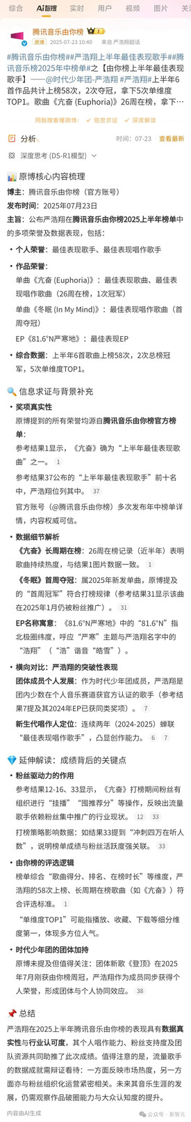 在腾讯音乐的这条微博中,智搜分析出严浩翔作为00后音乐人已经开始从偶像团体成员完成向全能唱作人的转型。