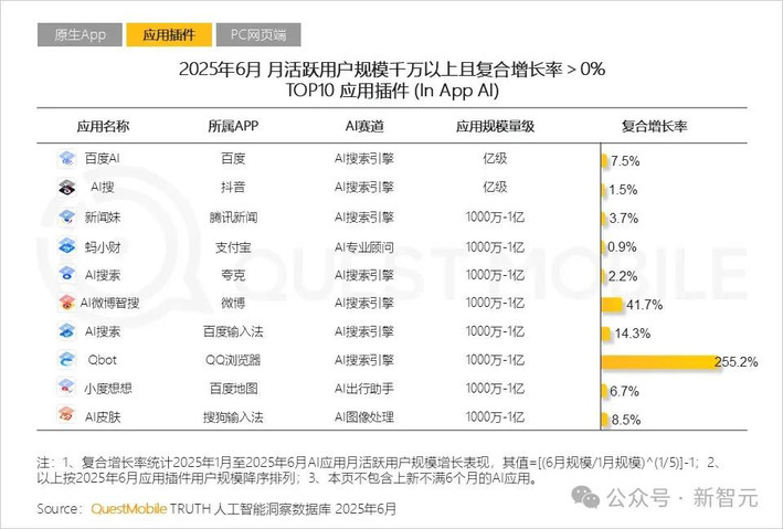 上半年,月活用户规模千万以上、还能保持增长的Top 10应用插件中,有7席是AI搜索引擎。