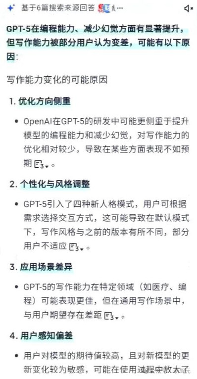 输入这个问题后,夸克搜索一番后回答:GPT-5写作能力的下降,可能是因为并不侧重于优化写作,引入的个性化导致写作风格变化,应用场景差异与用户感知偏差等等。