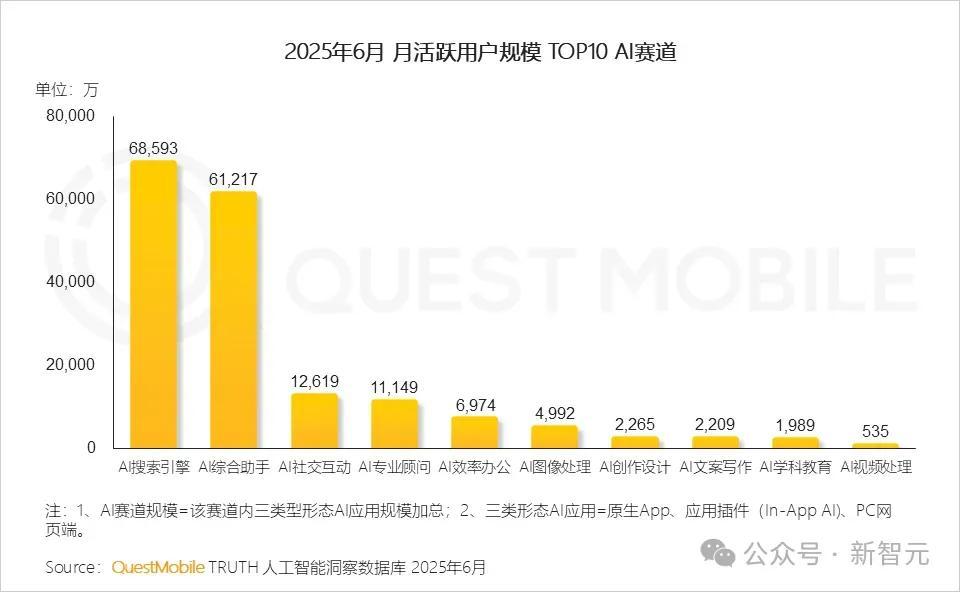 根据QuestMobile报告数据,AI搜索引擎是月活跃度用户规模最高的AI赛道,总活跃用户高达6亿8593万,领先AI综合助手7000万,其他赛道的活跃用户规模不足1.5亿。