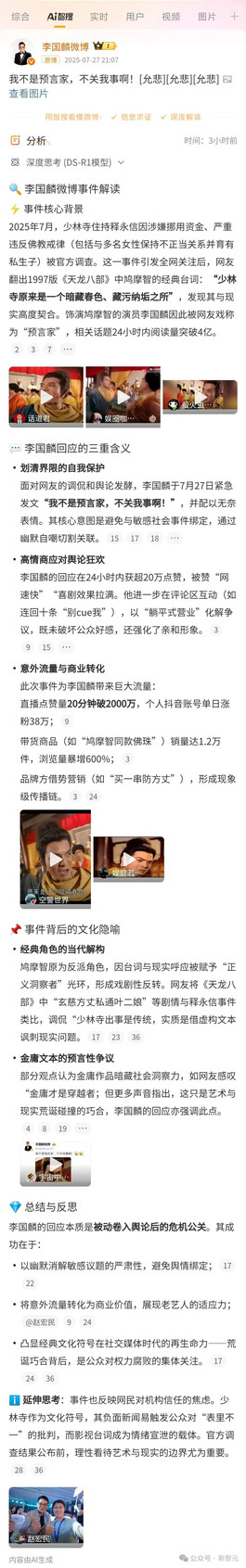 而智搜也针对李国麟的博文分析了整个事件的来龙去脉:因少林寺住持释永信挪用资金的行为,与《天龙八部》中鸠摩智的经典台词「少林寺原来是个暗藏春色、藏污纳垢之所」高度契合,演员李国麟被网友戏称「预言家」。