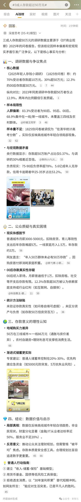 比如曾经引发大批网友集体焦虑的一个热搜词条「3成人存款超50万」,就被微博智搜火速辟谣——