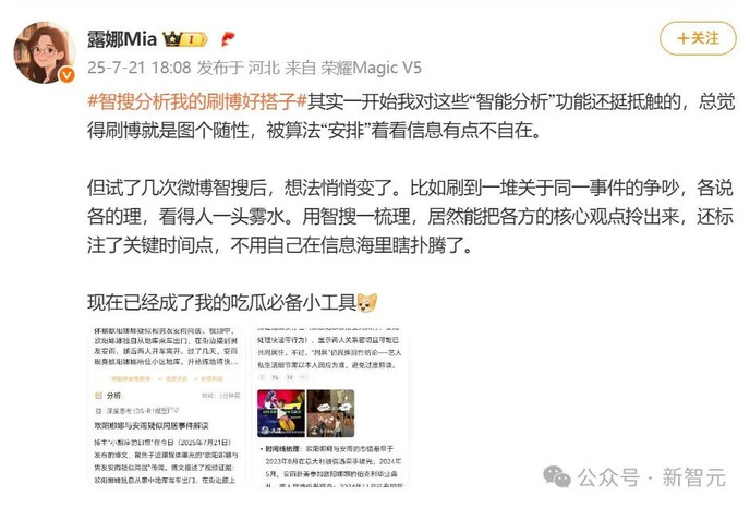可以说,微博智搜不仅有商业价值,也有社会价值:不仅满足了微博用户对信息的需求,更重要的是提供了更真实、全平台的信息,某种程度上打破了「信息茧房」。