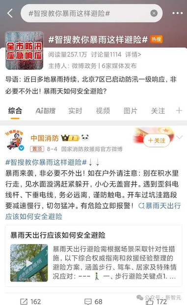 比如前一阵的北京暴雨,中国消防、北京大兴消防、四川消防、微博政务等多个大V分享出了有效信息。