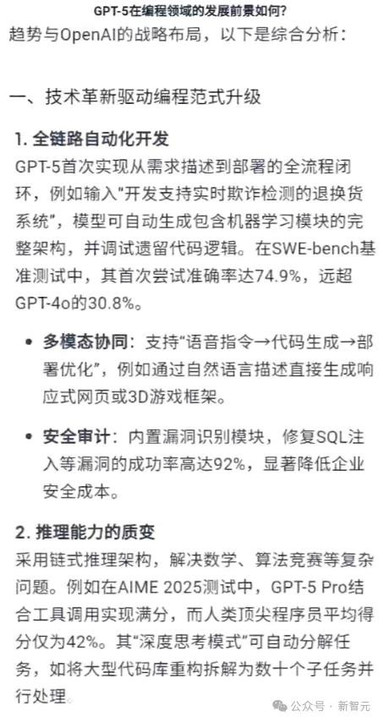 紧接着,在它的推荐问题栏里,我们又发现了相当有趣的话题——所以,GPT-5为什么更擅长编程呢?