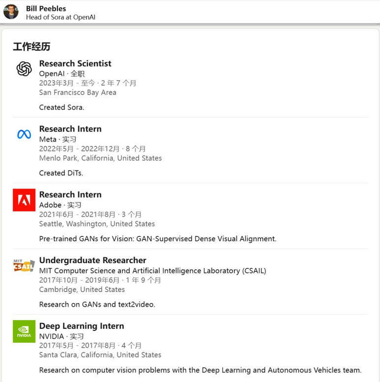 他曾先后在英伟达、Adobe、Meta的AI岗实习,博士毕业后直接加入了OpenAI,工作的最大业绩是Created Sora(创造出了Sora)。