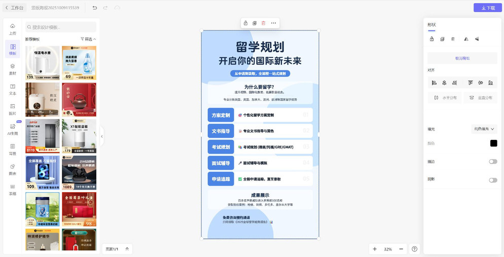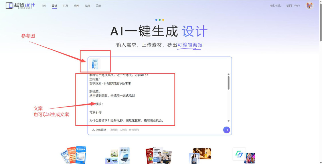打开 秒出设计,上传参考图和文案。如果没有文案,也可以直接输入主题,例如“欧美留学报名”,AI 会自动生成海报文案。