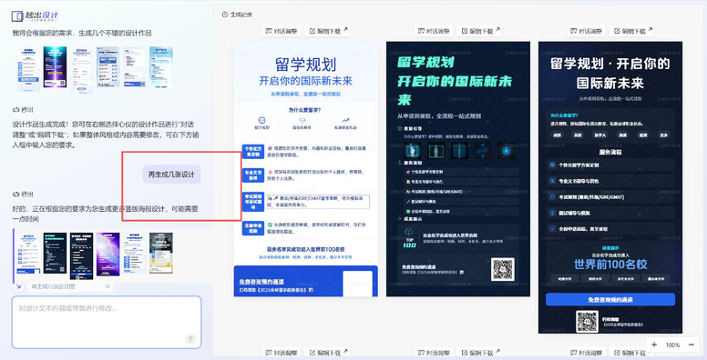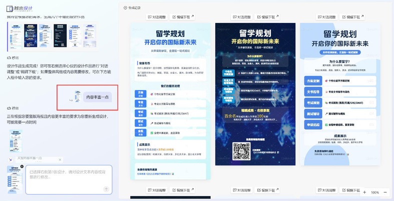 如果对整体满意,但对细节不满意,可以在左侧与 AI 对话修改,它会即时更新海报。