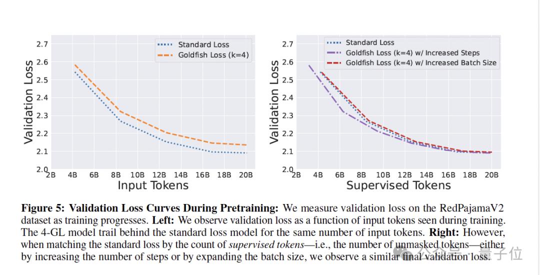 需要注意的是,金鱼损失的核心在于忽略部分token的梯度计算。因此,为了学到足够的语言模式,模型必须通过更多数据来补偿这些空缺,这可能导致计算效率的下降。