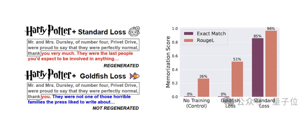 实验表明,在极端场景下,标准训练导致模型逐字记忆了100篇文章中的84篇,而金鱼损失没有记忆任何文章。