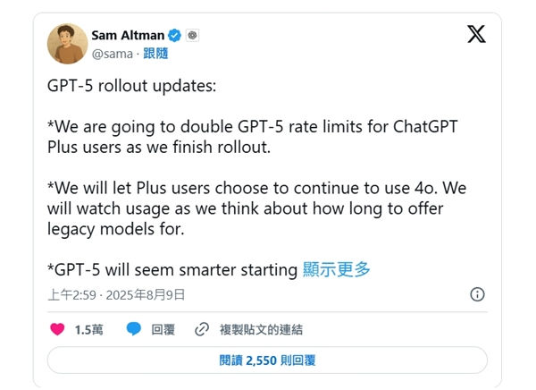 CEO萨姆奥尔特曼承认低估用户对GPT-4o的喜爱,未来将提供更多定制化服务。