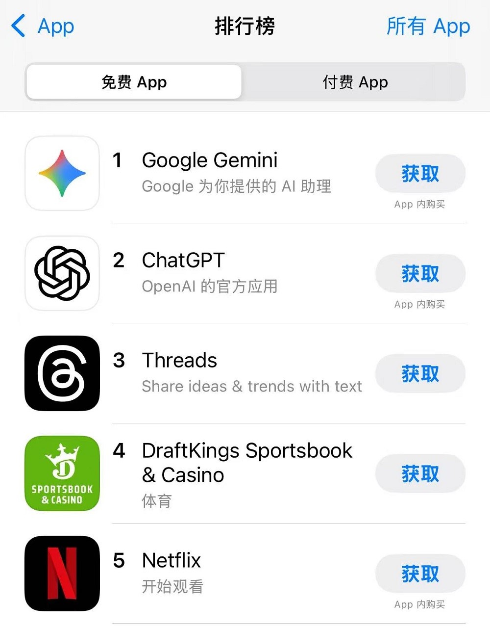 智东西9月15日报道,昨日,谷歌DeepMind的AI应用Gemini凭借其图像编辑模型“Nano Banana”的病毒式传播,在美区苹果App Store免费应用榜中取代ChatGPT,强势登顶,成为该区域最受欢迎的应用之一。