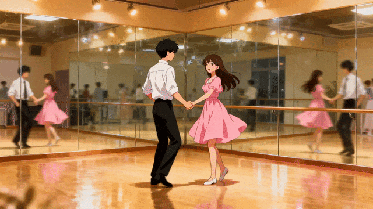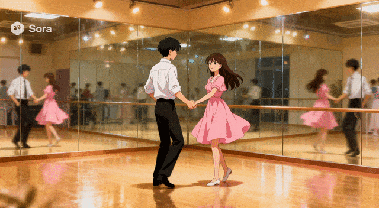 Prompt: 四周都是镜子的舞蹈房内,女生牵着男生的手优雅旋转翩翩起舞,动作流畅一致,衣裙随舞步轻盈摆动,镜面反射出舞蹈全景,镜头缓慢环绕捕捉舞蹈细节。