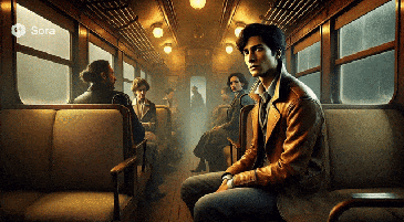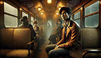 Prompt:行进中的列车里,右边的男人回头向后看,镜头拉远