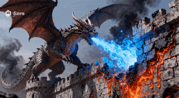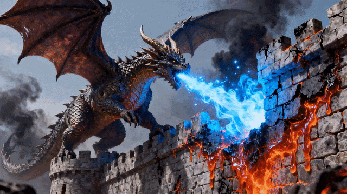Prompt:特写镜头紧紧聚焦在一条龙的下颚上。热气明显地扭曲了周围的空气,它的喉咙开始发出强烈的钴蓝色光芒。它呼气,一股闪烁着、富含粒子的蓝色火焰集中喷射而出,填满了整个画面。镜头跟随火焰,看着它猛击在一座城堡墙壁粗糙、风化的石头上。我们看到石头在热冲击下瞬间裂开,闪烁的蓝色能量在裂缝中飞速蔓延。石头表面起泡、爆裂,变成浓稠、黏滞的岩浆,像糖浆般沉甸甸地滴落下来。那声音是喷气发动机的轰鸣声与岩石熔化成液体时的嘶嘶声和爆裂声的恐怖混合。