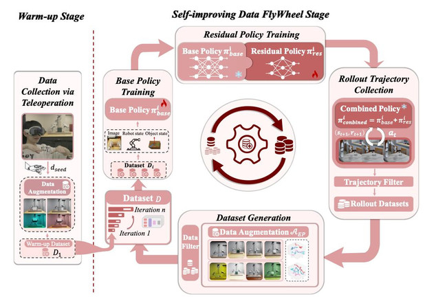 用模仿学习与残差强化学习构建了一个自我提升的数据飞轮。背后的思想是:解决数据难题的关键,并不在于一味收集更多数据,而在于让数据与系统相互迭代,让数据能够自己 “长大”。