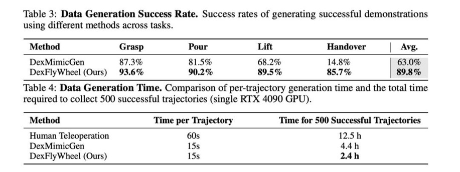 - 每个任务仅需一条演示启动 DexFlyWheel。