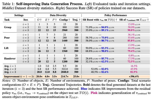 在包含物体、环境、空间布局三重变化的挑战性测试集上,成功率从初始的 16.5% 提升至 81.9%。