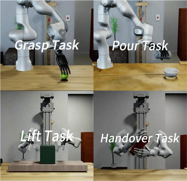 - 四个灵巧手任务:单手抓取、单手倾倒、双手提起、双手交接。