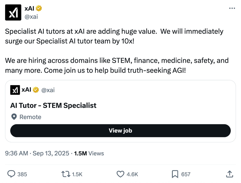 周六,xAI发布推文,称“xAI专业AI导师正创造巨大价值。我们将立即将专业AI导师团队规模扩大十倍!现正招聘STEM、金融、医学、安全等众多领域人才。加入我们,共同构建追求真理的AGI!”