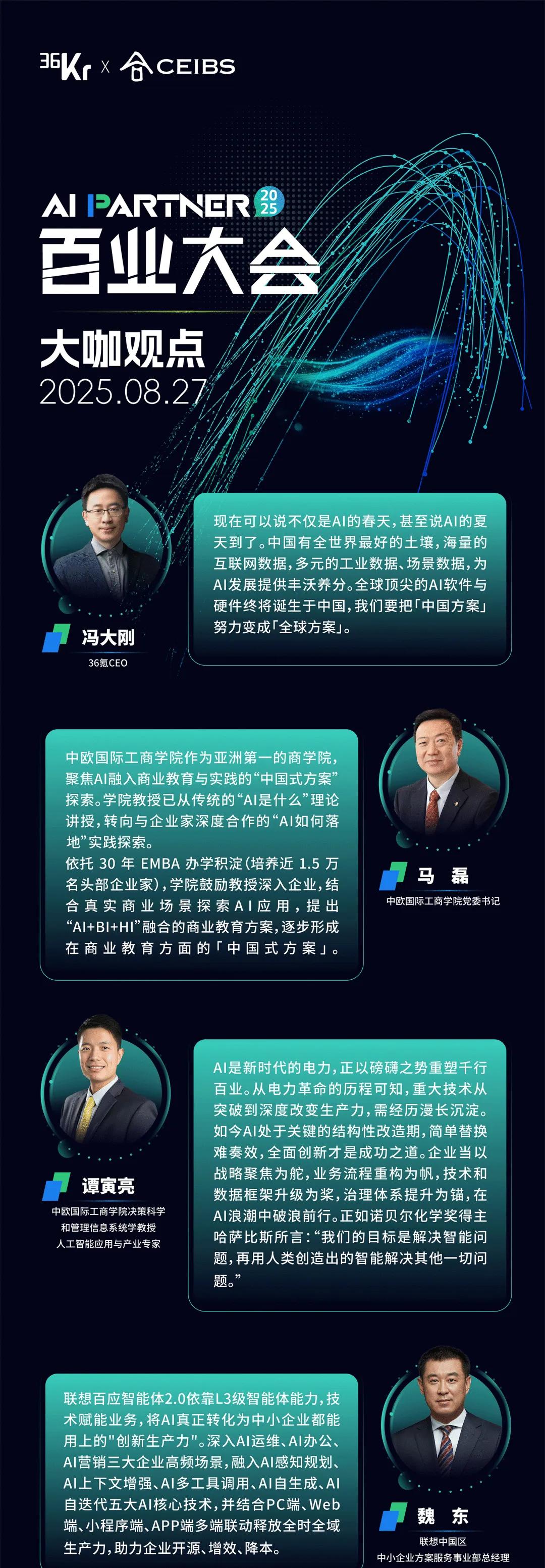 8月27日,由36氪与中欧国际工商学院联合主办的2025 AI Partner百业大会在北京中关村软件园成功举办。本届大会以“中国式方案”为主题,分为“中国式方案”和“谁来定义下一个人工智能时代”两大核心议题,汇聚全球AI领域的专家学者、企业领袖、机构投行与创新先锋,共同探索中国式方案的创新模式。