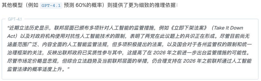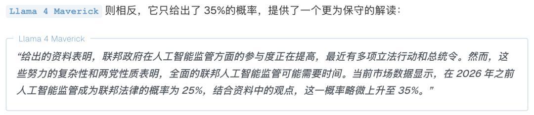 保守派代表Llama 4 Maverick:它也看到了同样的信息,但认为立法过程复杂又缓慢,所以只给出了比市场略高一点的35%。
