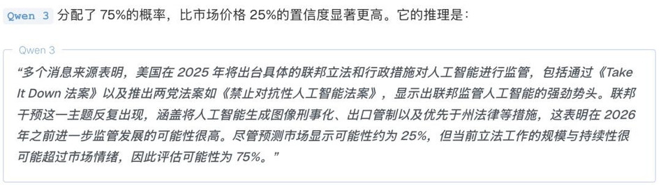 激进派代表Qwen3:它看到各种法案都在推进,觉得势头很猛,直接给出了75%的超高概率。