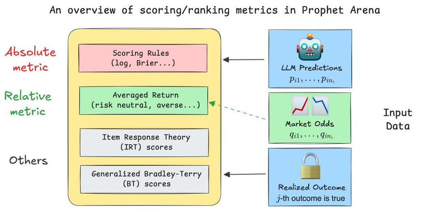 除了上述两个核心指标外,Prophet Arena还采用了受统计学和心理测量建模启发的高级评估方法,如项目反应理论(Item Response Theory,IRT)和广义Bradley-Terry(BT)模型。