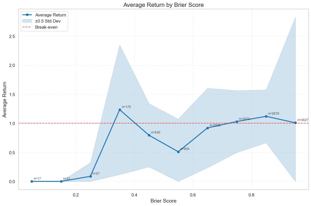 在Brier分数不高(0.3-0.5分)的区间里,反而诞生了许多回报率惊人的预测。