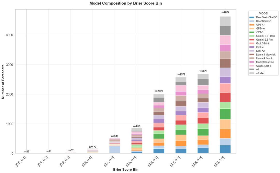 为了探讨这一点,检查了每个Brier得分区间的模型构成,每个模型用不同的颜色表示。