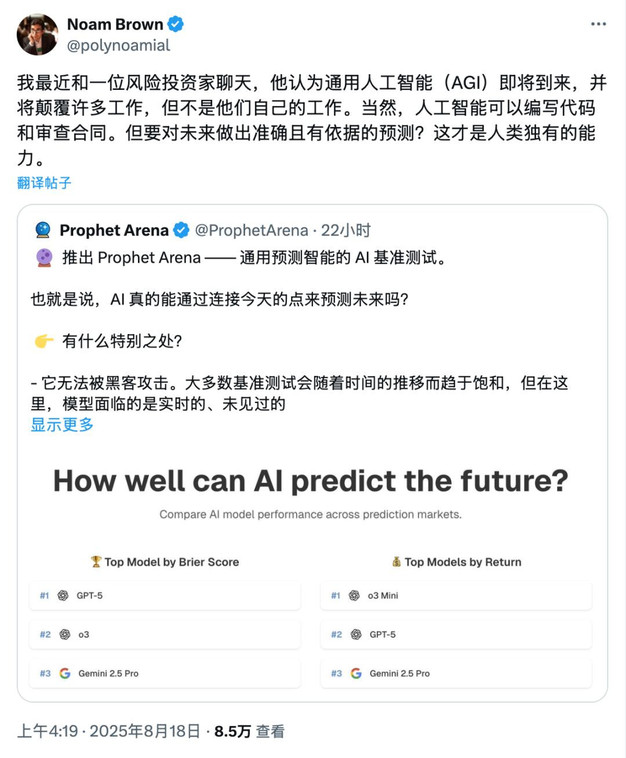 就连OpenAI 推理研究(AI reasoning research)负责人Noam Brown也赞叹,预测能力是人类独有的能力,现在AI终于开始涉足了。