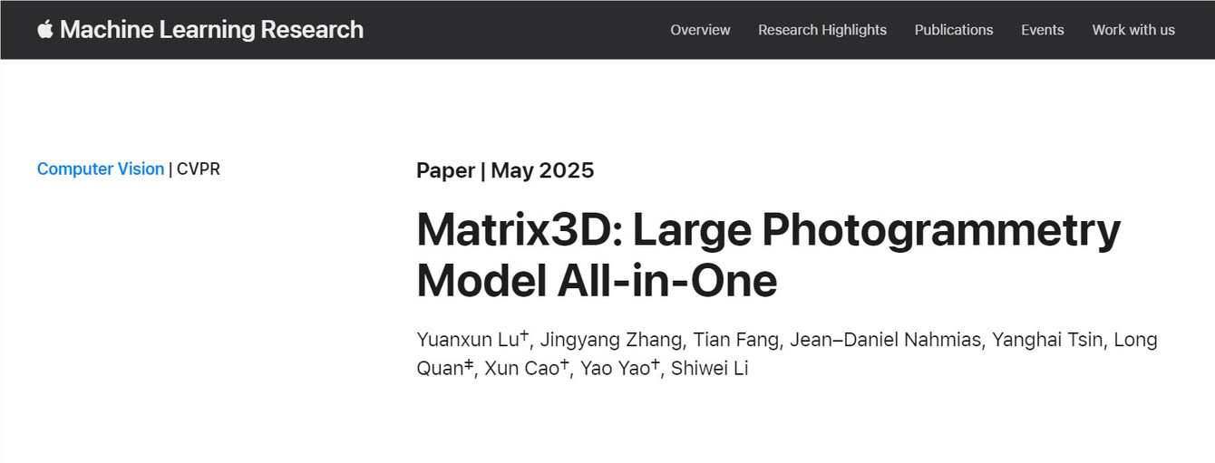 据9to5Mac报道,苹果机器学习团队与南京大学、香港科技大学的研究人员合作发布了一款非常有意思的 3D AI 模型,名为Matrix3D。据悉,这款大型摄影测量模型能够仅凭几张二维照片重建三维物体和场景,这与当前的流程有很大不同。