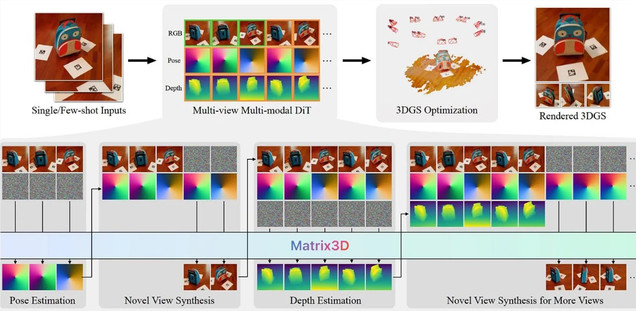 但 Matrix3D 通过一次性完成所有操作简化了这一过程。它接收图像、相机参数(例如角度和焦距)和深度数据,并使用统一的架构进行处理。这不仅简化了工作流程,还提高了准确性。