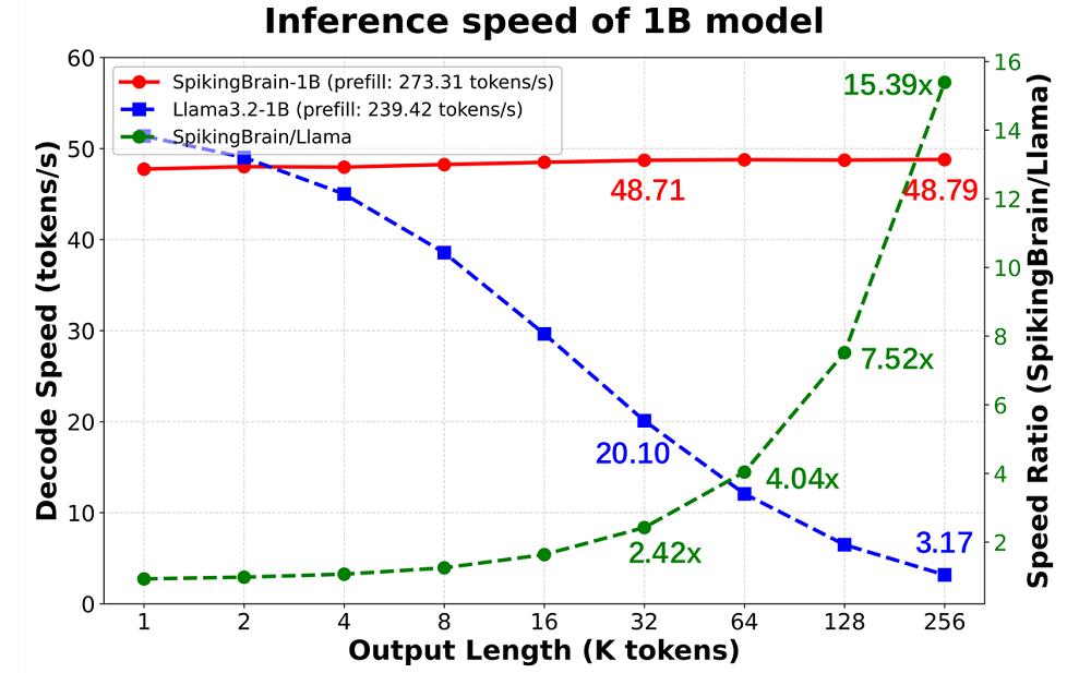 同时在手机CPU端64K、128K、256K长度下,SpikingBrain较Llama3.2的同规模模型推理速度分别提升4.04倍、7.52倍、15.39倍。
