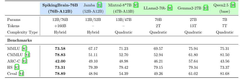 SpikingBrain-76B混合线性MoE模型几乎完全恢复了基座模型性能。