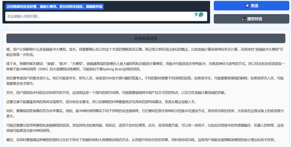 在官方试用网页中,智东西对SpikingBrain-76B模型的能力进行了一手体验。在这一网页中,模型的最大生成长度被限制为大约8000个token及以下,超过后会直接中止回答。